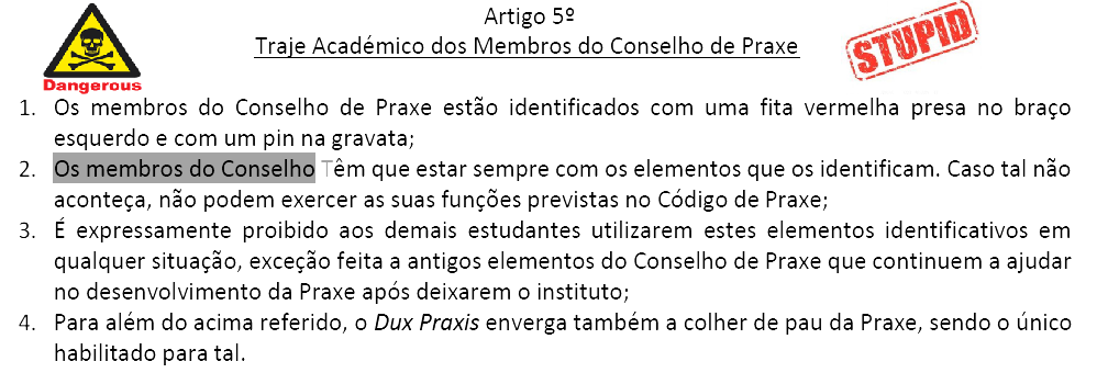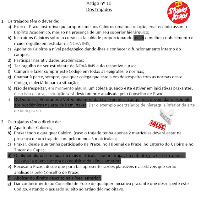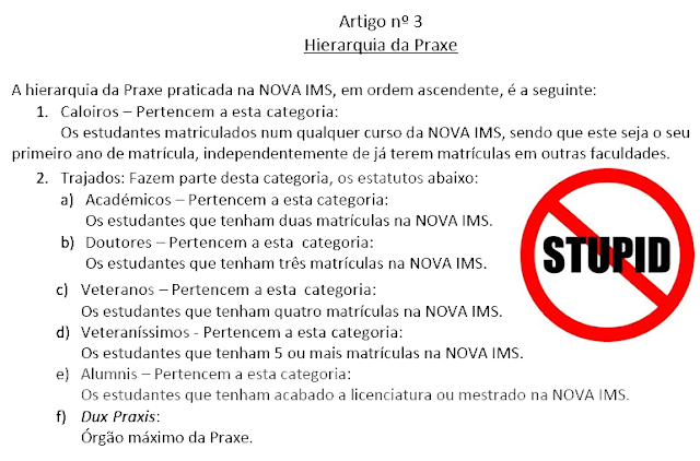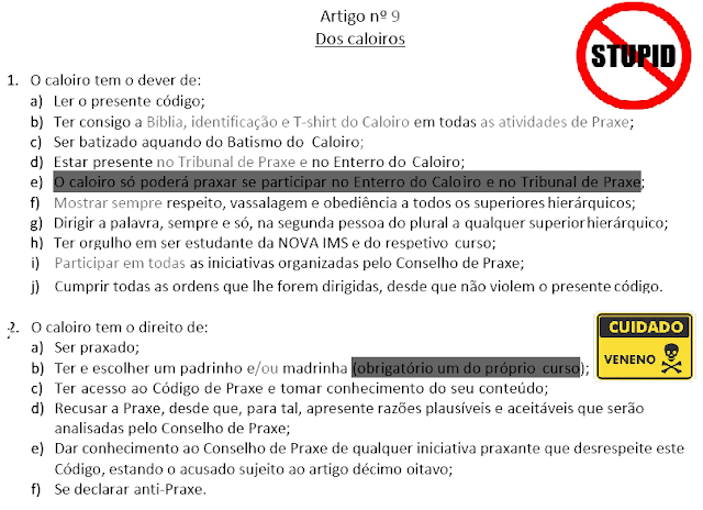 Não diferenciar Praxe de gozo ao caloiro e, dentro de esse âmbito, dos abusos que são as perseguições e castigos perpetrados por trupes (e incompatíveis, portanto, com o gozo, com a Praxe, e sobretudo com a lei portuguesa) mostra bem que isto está entregue aos mais ineptos e a pessoas de má índole.